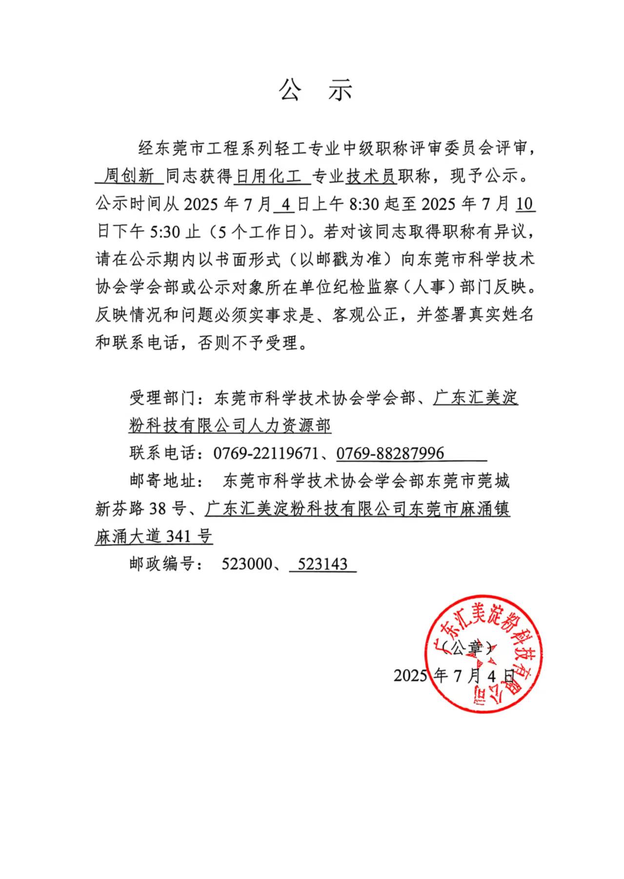 受理部門:東莞市科學技術協(xié)會學會部、廣東匯美淀粉科技有限公司人力資源部